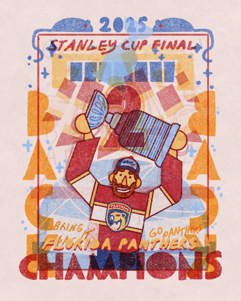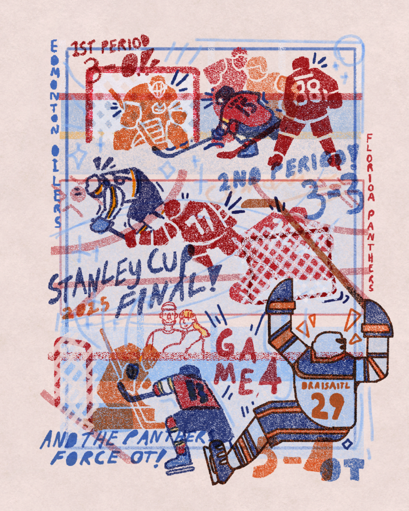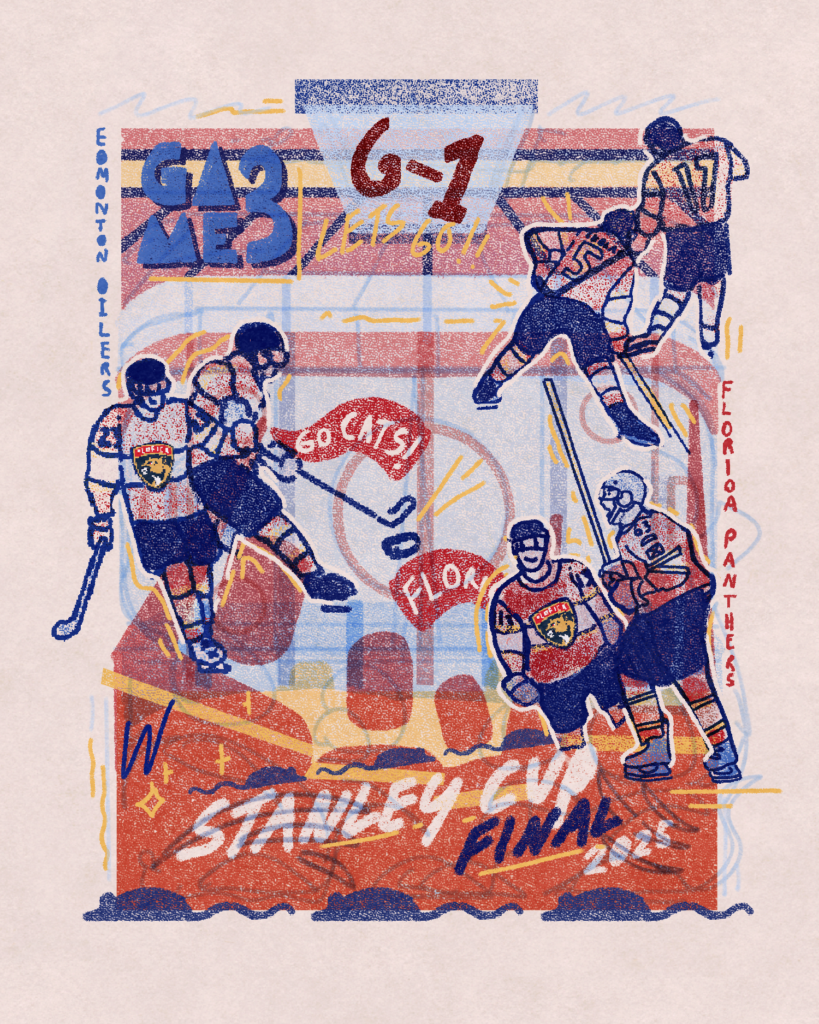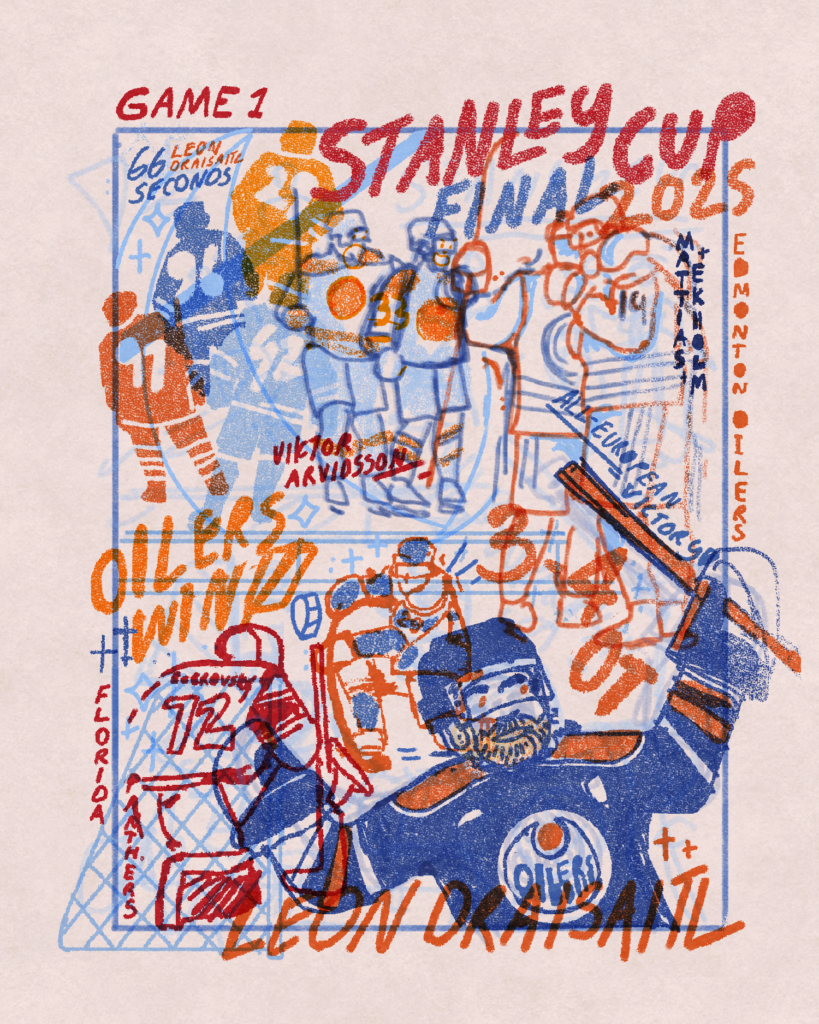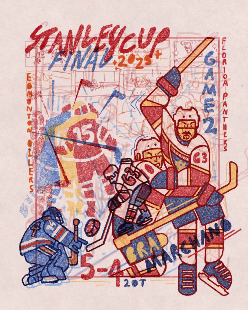 I was asked by NHL Europe to capture each game in the Stanley Cup Finals between the Florida Panthers and Edmonton Oilers in a series of sketches done in the morning right after the game.